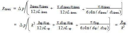 水壓缸兩端密封為兩個并聯(lián)的流阻,且其結構參數(shù)間存在著線性比例關系, 比例因子 k = 0. 733 。由于水壓缸單端密封的流阻主要集中在3 道活塞環(huán)上,因此,取其中1 道活塞環(huán)為研究對象,下標“up”表示水壓缸上端活塞環(huán)密封,下標“down”表示水壓缸下端活塞環(huán)密封, 則由式(2) 可知: