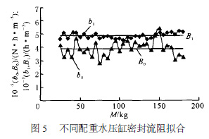 在控制棒水壓驅動機構單缸步進性能實驗[7 ] 中,從開始充壓到水壓缸內套動作這一段時間定義為步升前充壓時間,在此段時間內,由于水壓缸內套未動作,回路中入缸流量等于泄漏流量,利用不同配重步升過程中的實驗數(shù)據(jù)即可求出水壓缸活塞環(huán)密封的泄漏流阻。用最小二乘法來擬合不同配重步升前充壓時間內的( R ,Δp) , 自變量為Δp , 函數(shù)為R = Δp/QV ,求出各個配重下的流阻擬合公式, 即不同配重實驗所對應的b0 和b1 值, 擬合結果示于圖5 , 其中, M 為配重??梢钥闯?對幾何結構一定的活塞環(huán)密封結構而言,不同配重實驗所對應的b0 和b1 值基本不變。取它們的平均值, B0 和B1 為計算公式中的系數(shù)。