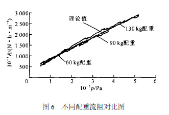 圖6 為60 、90 和130 kg 配重實驗結果與理論公式計算所得流阻的對比曲線。該曲線顯示,實驗結果與公式計算結果吻合得很好。同時,可以看出,隨著配重的增加,步升開始所需壓力逐漸增大,步升前充壓時間逐漸變長,流阻對應的壓力范圍隨之逐漸增大。